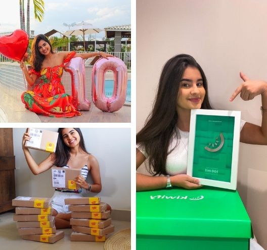 Nas fotos ao lado, três grandes momentos da minha trajetória: primeiro 10k de seguidores, o dia em que mais vendi na minha loja e minha tão sonhada plaquinha de 100 mil em vendas.